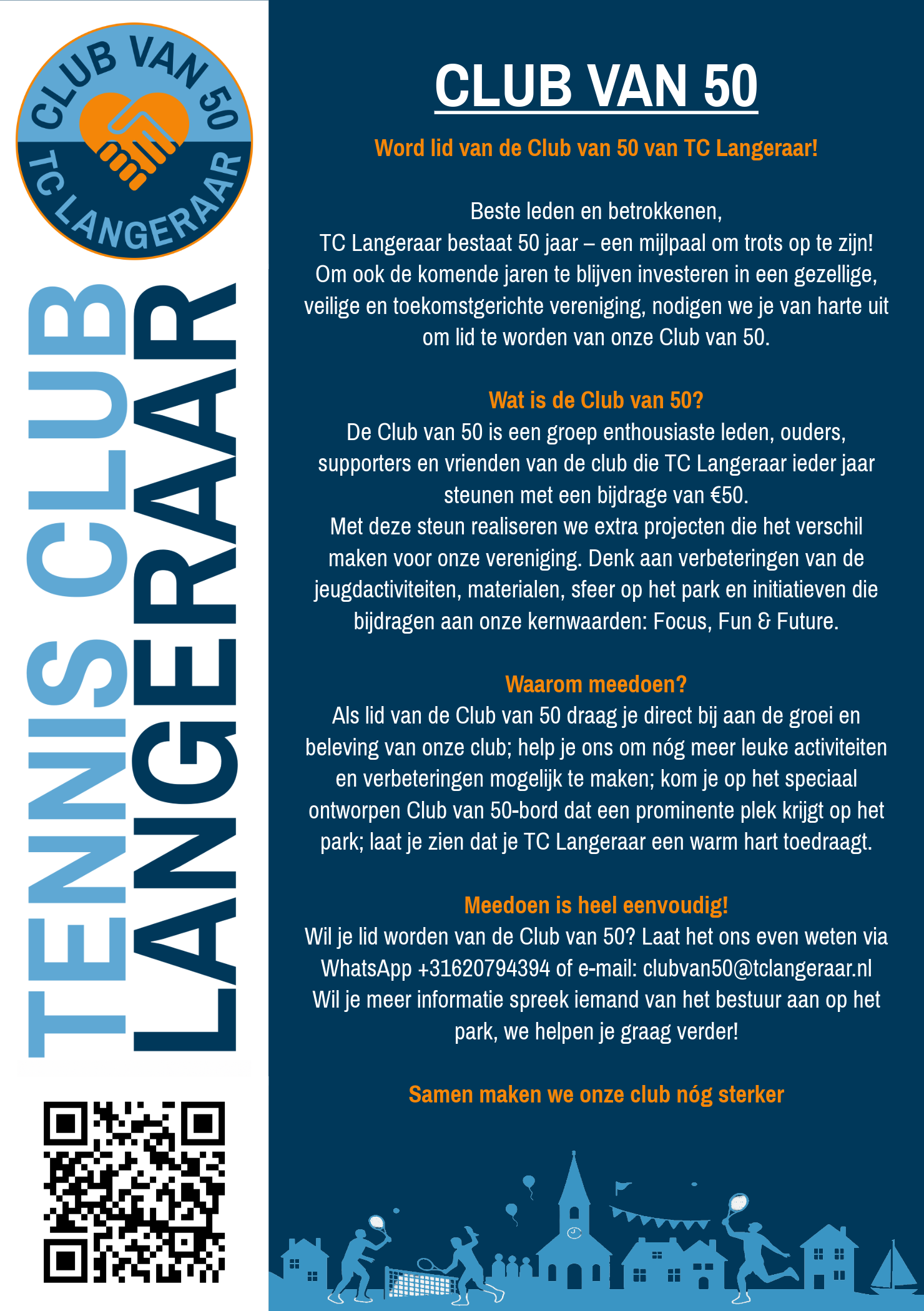 De Club van 50 is een groep enthousiaste leden, ouders, supporters en vrienden van de club die TC Langeraar ieder jaar steunen met een bijdrage van β¬50.
