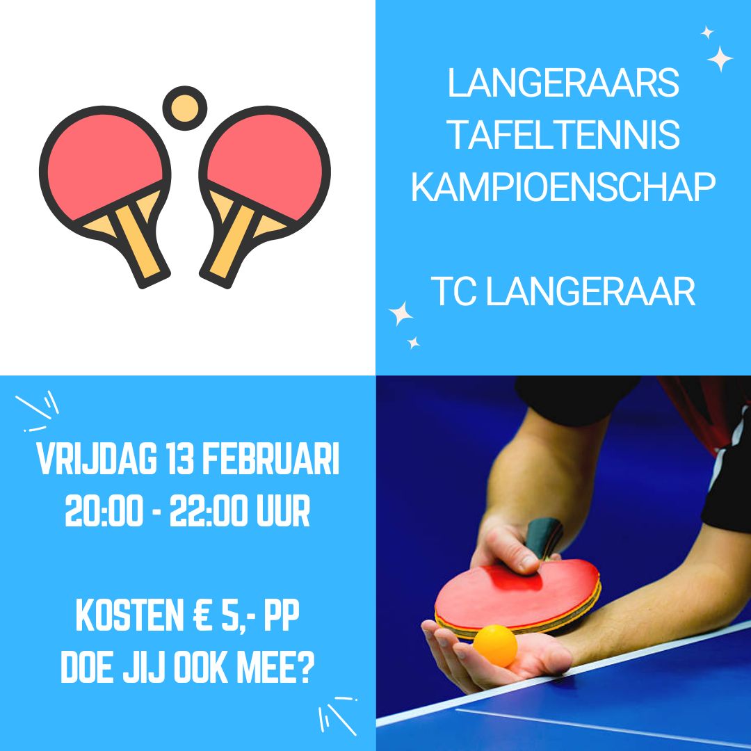 Op vrijdag 13 februari organiseert het dynamische duo Rico en Mario het Langeraars Tafeltennis Kampioenschap!